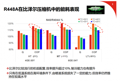 R-448A在商超制冷系統(tǒng)中比R-404具有優(yōu)勢(shì),低耗能,環(huán)保。溫室效應(yīng)比R404A降低67%,電耗降低5-15%,低壓低10%+,高壓略低,不需更新壓力容器設(shè)計(jì)、流量 75%,膨脹閥設(shè)定調(diào)整, 制冷劑管路 直徑可降低,密度略高,充注量略高(0%~3%)。
