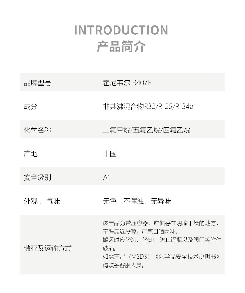 霍尼韋爾R407F制冷劑,商品名稱有 Genetron Performax® LT 制冷劑、R407F等,R407F屬于HFC型非共沸環(huán)保制冷劑(完全不含破壞臭氧層的CFC、HCFC),廣泛用于新冷凍設(shè)備上的初裝和維修過程中的再添加。